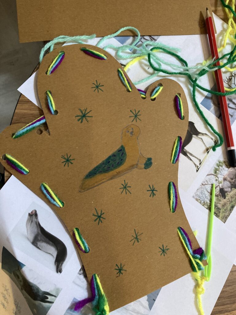 Using yarn to make double-thumbed mittens like the Arctic community in the book we were reading.